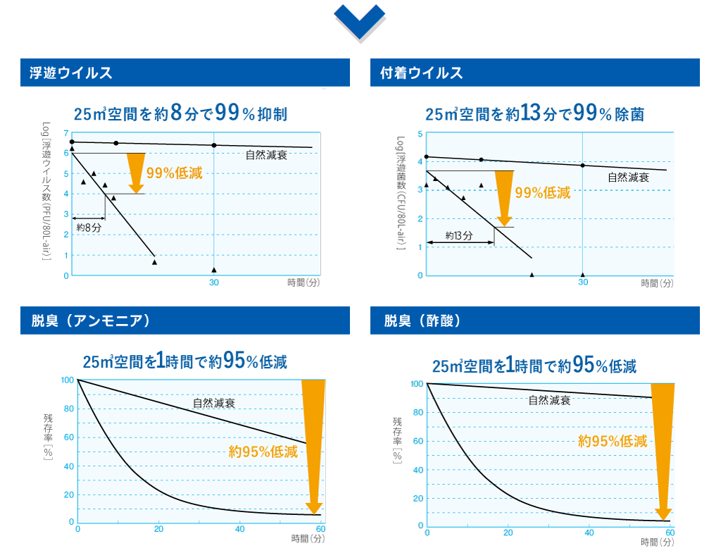 検証では、大腸菌ファージ・A型インフルエンザウイルス・ネコカリシウイルスなどへの抑制に効果があることが明らかになっているほか、アンモニア・酢酸・トリメチルアミン・ノネナールに対する脱臭効果も発揮します。