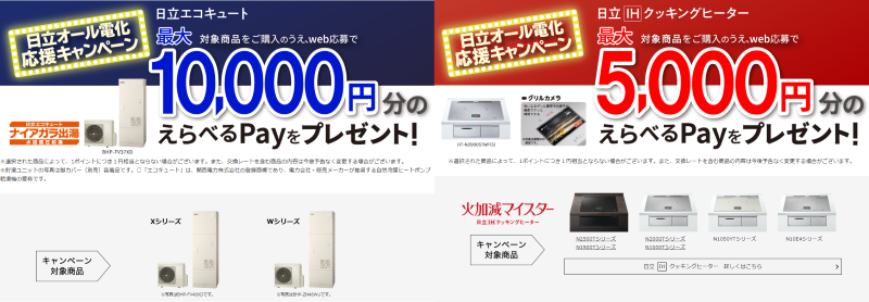 キャンペーン期間に対象となる機種をご購入のうえwebで応募すると、エコキュートは10,000円分・IHクッキングヒーターは5,000円分のえらべるPayがもらえます!