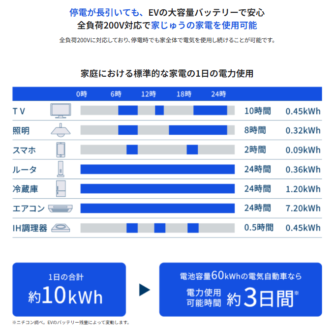 ・停電時はEVから家で自動で放電。エアコンやIHクッキングヒーターなどの200V機器が使える「全負荷型」なので停電時も安心です。