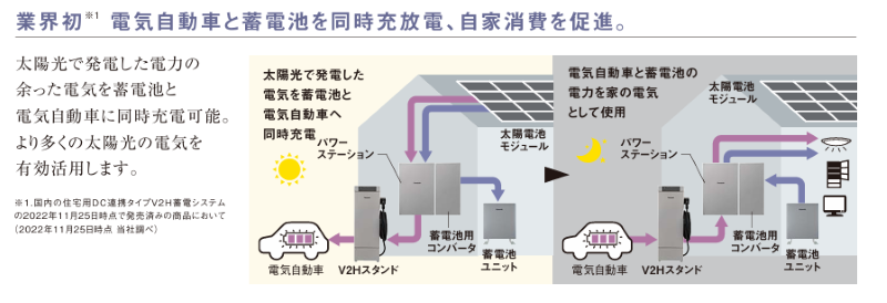 通常、EV充電設備とは家庭用の電力を電気自動車(EV)へと給電する機器のことで、電気自動車(EV)の電力を自宅に送り込むことはできません。V2Hは電気自動車(EV)の電力を自宅に給電できるようにすることで「災害時の備え」を可能にしました。