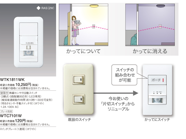 こちらの商品は人感センサがついていない普通の片切スイッチからの交換も可能です。